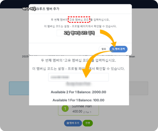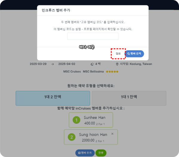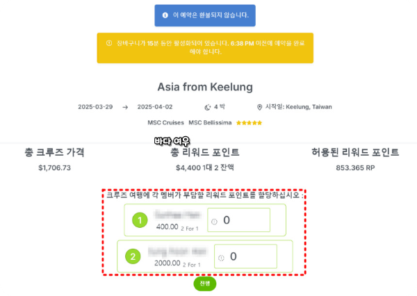 같이 여행하시는 분이 크루즈 멤버십을 활성화하셨다면, 나의 부족한 1대 2 포인트를 같이 여행 가시는 분의 포인트를 추가하여 객실 가격의 50%까지 사용하실 수 있습니다.