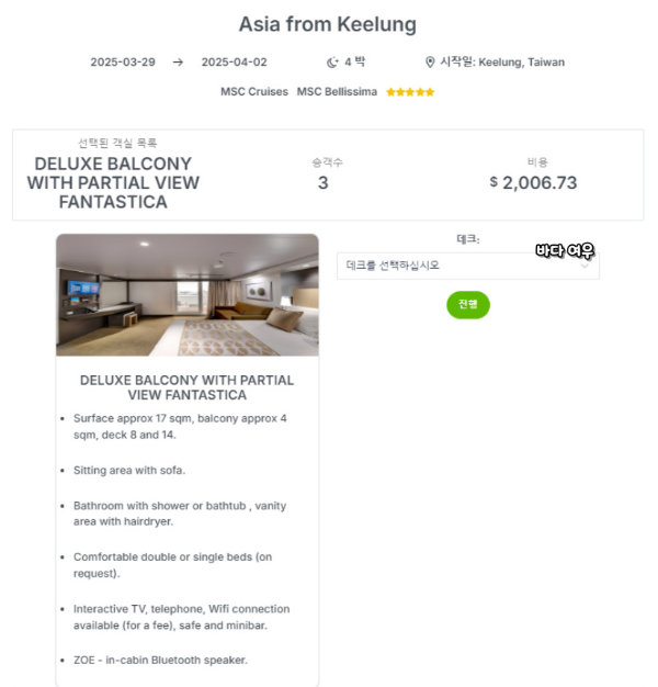 우측 배 이미지를 확인하여 객실을 선택합니다.