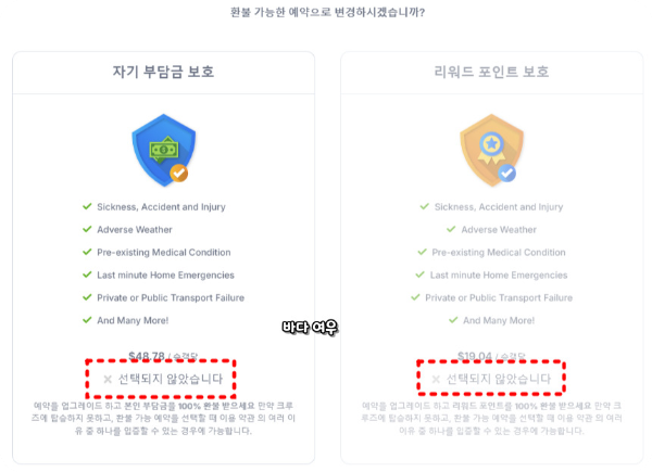 여기서 자기 부담금 보호와 리워드 포인트 보호가 있으며, 이것을 선택할 경우 가격은 올라갑니다. 저는 무조건 가는 거라서 전부 선택하지 않았습니다.