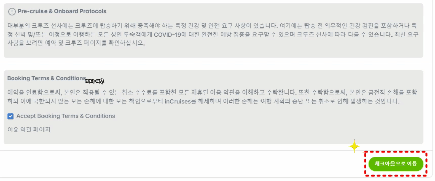 계약서 내용을 확인하고, 모두 수락을 선택합니다. 그다음에는 '체크아웃으로 이동'을 선택합니다.