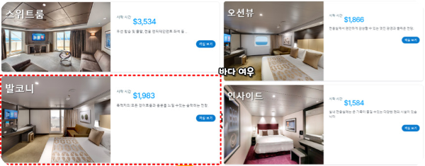 크루즈 객실은 스위트룸, 발코니, 오션뷰, 인사이드 4가지 종류가 있습니다.